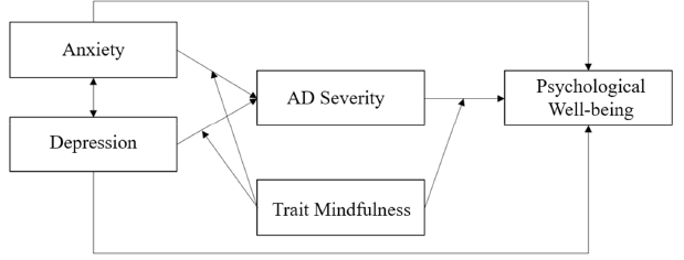 The literature review suggests a possible model of the relationship between anxiety, depression, AD severity, TM, and psychological well-being (Figure 1), in which AD severity may act as a mediator between anxiety/depression and psychological well-being, and TM may moderate the relationship between anxiety/depression and AD severity or the relationship between AD severity and psychological well-being.