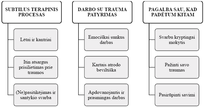 Atlikus teminę analizę, atsiskleidė trys pagrindinės temos: 1) subtilus terapinis procesas; 2) darbo su trauma patyrimas; 3) pagalba sau, kad padėtum kitam. Kiekvienoje temoje taip pat išskirta po tris potemes. Bendrai temos ir potemės pavaizduotos paveiksle.