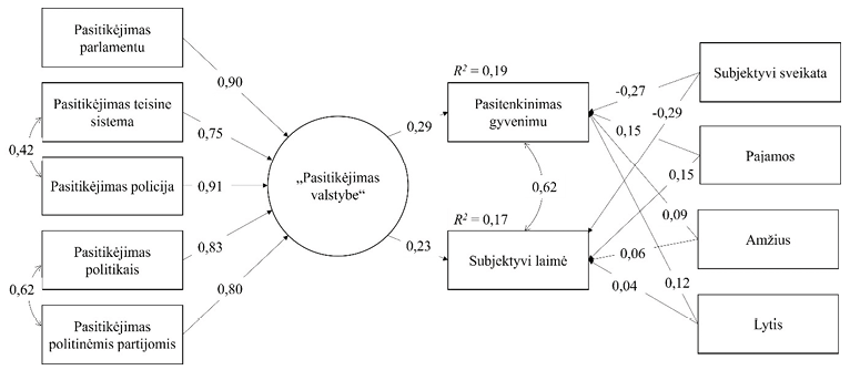 Siekiant nustatyti ryšį tarp pasitikėjimo valstybės institucijomis ir gyvenimo kokybės, buvo atliekamas struktūrinis lygčių modeliavimas. Pasitikėjimas atskiromis valstybės institucijomis buvo jungiamas į vieną latentinį kintamąjį „Pasitikėjimas valstybe“. Į modelį taip pat buvo įtraukti penki kontroliniai kintamieji – lytis, amžius, subjektyvus sveikatos vertinimas, namų ūkio pajamos ir išsilavinimas metais. Kontroliniai klausimai šioje analizėje buvo naudojami priklausomų kintamųjų – pasitenkinimo gyvenimu ir subjektyvios laimės – prognozei. Pirminiai rezultatai atskleidė, kad modelis nėra visiškai tinkamai suderintas su duomenimis (χ2 (38) = 134 152,83, p < 0,001, CFI = 0,89, TLI = 0,85, RMSEA = 0,11, SRMR = 0,08). Atsižvelgiant į aukštas koreliacijas tarp kintamųjų (> 0,65) ir siūlomas modelio modifikacijas, buvo nuspręsta įtraukti papildomas kovariacijas tarp pasitikėjimo policija ir teisinės sistemos, tarp pasitikėjimo politinėmis partijomis ir politikais ir pasitenkinimo gyvenimu ir subjektyvios laimės (žr. paveikslą).