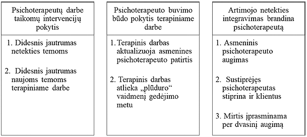 Tęsiant toliau, šis tyrimas, pritariantis kitų autorių darbams ir juos praplečiantis, parodė, jog gedinčiam psichoterapeutui dažnai tenka dorotis su terapijų metu kylančiu psichologiniu skausmu ir sunkiais netekties prisiminimais, kuriuos aktualizuoja klientų pasakojimai (Cvetovac & Adame, 2017; Kouriatis & Brown, 2014; Zerubavel & Wright, 2012). Psichoterapeutai gali veidrodiniu principu susitapatinti su kliento jausmais, todėl tai gali paveikti ir jų naudojamas terapines intervencijas. Jautrių temų vengiantis terapeutas rizikuoja ir terapinio darbo kokybe. Literatūroje teigiama, kad toks terapeutas terapiniame darbe kurį laiką gali nebeužsiimti gilesniu nagrinėjimu, terapinės įtampos kėlimu, konfliktų sprendimu ir atsparumo stiprinimu (Antonas, 2002). Todėl psichoterapeutui atsiranda poreikis nuolat sąmoningai stebėti savo reakcijas, išgyvenimus ir naudojamas intervencijas ypač sunkiu metu jo asmeniniame gyvenime.