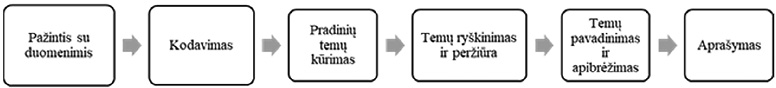 Duomenims analizuoti buvo pasirinktas teminės analizės metodas pagal Braun ir Clarke (2022) rekomendacijas. Šis metodas yra patogus būdas sistematiškai kurti pasirinkto fenomeno aiškinamuosius modelius, lengvai pritaikomas įvairių dydžių imtims, patogus duomenis analizuojant tiek indukciniu, tiek dedukciniu būdais ir skirtas apibendrinti naujus, iki šiol netyrinėtus mokslinius klausimus (Braun & Clarke, 2017). Teminės analizės žingsniai pateikiami 1-ame paveiksle.