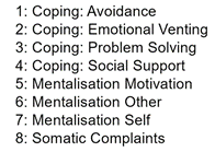 In summary, the network analysis identified self-oriented mentalization and motivation to mentalize as the most central variables, based on multiple centrality indices. Somatic complaints, along with avoidance and emotional venting coping strategies, showed low centrality, suggesting limited connectivity within the network. Clustering analysis indicated that somatic complaints and other-oriented mentalization were part of more interconnected clusters, while self-oriented mentalization and avoidance showed lower clustering coefficients.