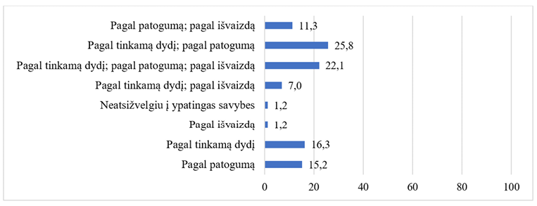 Atsakydami į klausimą ,,Į ką atsižvelgiate rinkdamiesi avalynę?“ respondentai turėjo galimybę pasirinkti vieną arba kelis atsakymo variantus. Paaiškėjo, kad respondentai (n = 21; 25,80 proc.), rinkdamiesi avalynę, vertina tinkamą dydį bei patogumą. Mažesnis respondentų skaičius (n = 19; 22,1 proc.) pasirinko visų trijų (dydžio, patogumo ir išvaizdos) avalynės ypatybių derinį. Mažiausias skaičius respondentų avalynę rinkosi tik pagal išvaizdą ir neatsižvelgė į jokias kitas ypatybes (n = 1; 1,2 proc.). Lyginant į šį klausimą gautus atsakymus tarp šalių, nustatytas skirtumas yra statistiškai reikšmingas p = 0,001 < 0,05 (9 pav.). P. K. Sutariya ir kt., išanalizavę tyrimo rezultatus apie pacientų, sergančių cukriniu diabetu, žinias pagal tinkamos avalynės pasirinkimą, nustatė, kad tik ketvirtadalis tiriamųjų žinojo apie tinkamos ir patogios avalynės svarbą. Pacientams trūksta žinių ir apie tinkamos avalynės pasirinkimą, kad būtų išvengta pėdų komplikacijų. Jie gali nesuprasti, kaip svarbu pasirinkti gerai prigludusią, tinkamą atramą suteikiančią ir spaudimo taškų nesukeliančią avalynę [16], tai patvirtina Y. Gao ir kt. atliktas tyrimas [17].