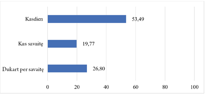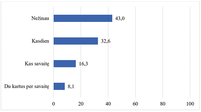 Anketoje pacientams buvo pateiktas klausimas ,,Kaip dažnai apžiūrite savo pėdas?“ Daugiau nei pusė respondentų (n = 46; 53,49 proc.) nurodė, kad pėdas apžiūri kasdien. Du kartus per savaitę pėdas apžiūri mažiau nei trečdalis respondentų (n=23; 26,8 proc.), o likę respondentai pėdas apžiūri tik kartą per savaitę (n = 17; 19,77 proc.) (12 pav.).