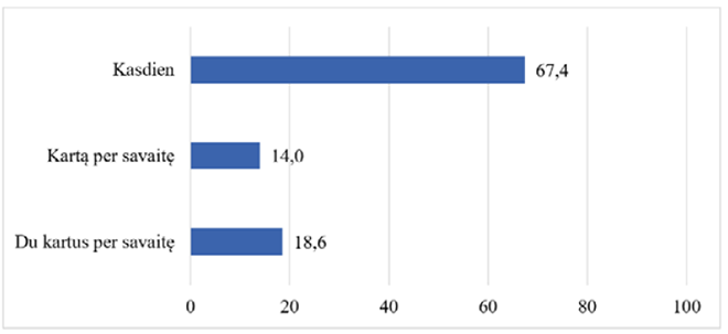 Tyrimo metu respondentų buvo klausiama, kaip dažnai jie keičia kojines. Paaiškėjo, kad didžioji dalis (n = 58; 67,4 proc.) respondentų kojines keičia kiekvieną dieną. Mažiau nei penktadalis respondentų kojines keičia du kartus per savaitę (n = 10; 18,6 proc.), mažiausiai atsakiusiųjų (n = 4; 14 proc.) teigia kojines keičiantys kartą per savaitę (8 pav.). N. Hirpha ir kt. tyrimu nustatė, kad tik 27,3 proc. pacientų keitė kojines kiekvieną dieną [11]. R. Van Amber ir kt. tyrimas ne tik pagrindė kasdienio kojinių keitimo naudą odai, tačiau ir įrodė, kad vilnonės kojinės, keičiamos kas dieną, turi įtakos odos kietumui, raginio sluoksnio hidratacijai, transepiderminiam vandens praradimui ir temperatūrai. Mokslininkų teigimu, kojinės ne tik turi būti keičiamos kasdien, bet dar geriau būtų dėvėti vilnones. Tačiau ne visi diabetinės pėdos pacientai žino apie kasdieninio kojinių keitimo naudą [15].