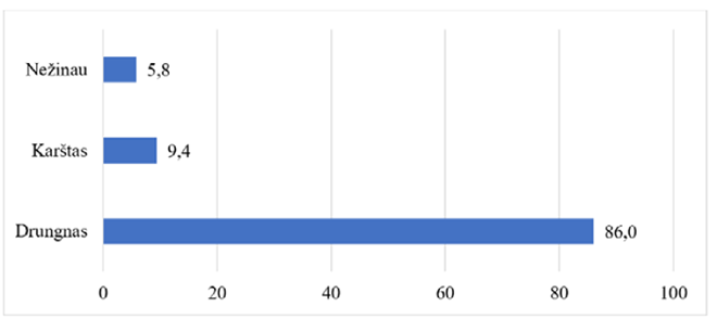Iš respondentų atsakymų į klausimą ,,Kokios temperatūros turi būti vanduo plaunant pėdas?“ paaiškėjo, kad didžioji dalis (n = 74; 86 proc.) žino, jog plauti pėdas labiausiai tinka drungnas vanduo, o mažiau nei dešimtadalis (n = 8; 9,4 proc.) teigia, kad pėdas plauti geriausia karštu vandeniu; tik 5,8 proc. (n = 5) respondentų atsakė, kad nežino (3 pav.).