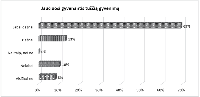 Dauguma respondentų atsakė, kad labai dažnai jaučiasi gyvenantys tuščią gyvenimą (69 proc.), mažuma teigia, kad jaučia gyvenimo pilnatvę (8 proc. ) (2 pav.).