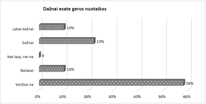 Gauti duomenys parodė, kad tik 10 proc. respondentų labai dažnai jaučiasi geros nuotaikos, o 58 proc. niekada nesijaučia geros nuotaikos (3 pav.).