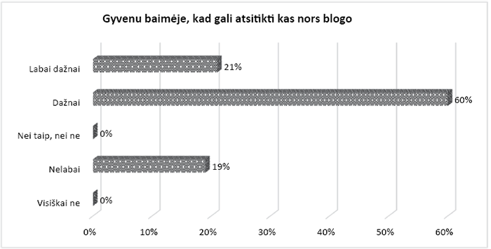 Tyrimo metu buvo nustatyta, kad 60 proc. respondentų dažnai gyvena baimėje, galvodami, kad gali atsitikti kas nors blogo (4 pav.).