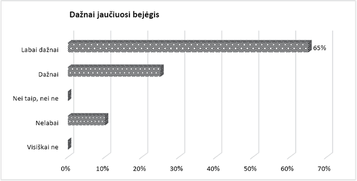Rezultatai atskleidė, kad didžioji dalis respondentų (65 proc.) labai dažnai jaučiasi bejėgiai, o 10 proc. – nelabai dažnai jaučiasi bejėgiai (5 pav.).