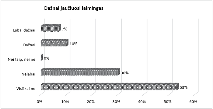Vertinant respondentų požiūrį, ar jie dažnai jaučiasi laimingi, nustatyta, kad daugiau nei pusė visiškai nesijaučia laimingi ir tik 7 proc. – labai dažnai jaučiasi laimingi (6 pav.).