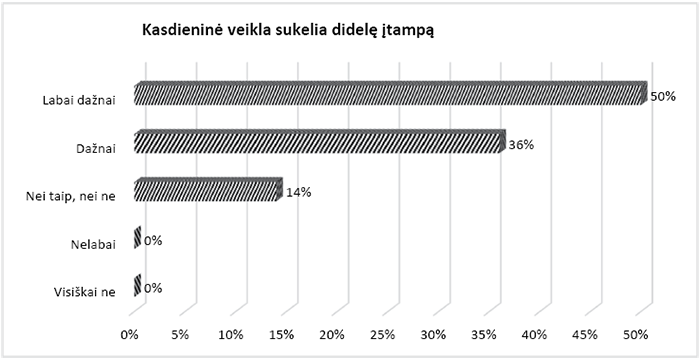 2. Įvertinus respondentų nuomonę apie kasdieninę veiklą, nustatyta, kad daugiau kaip pusė respondentų yra visiškai nepatenkinti savo kasdienine veikla, pusė respondentų nurodė, kad dažnai kasdieninė veikla yra labai varginanti ir sunki, labai dažnai sukelia didelę įtampą; nebuvo nė vieno respondento, kuriam kasdieninė veikla nekeltų didelės įtampos.