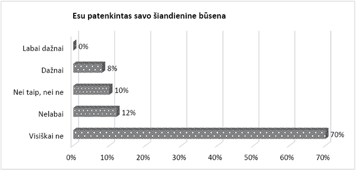 Savijautos vertinimas. Atliktas tyrimas parodė, kad didžioji dalis respondentų yra visiškai nepatenkinti savo šiandienine būsena, o 8 proc. dažnai yra patenkinti savo šiandienine būsena (1 pav.).