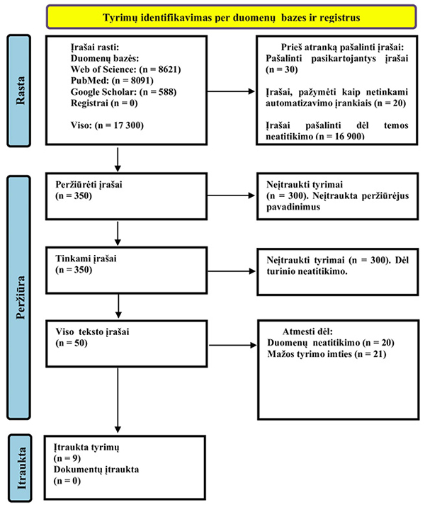 Tyrimo medžiaga ir metodai. Atlikta mokslinių straipsnių apžvalga naudojant reikšminius žodžius ir jų junginius: perdegimo sindromas (angl. burnout syndrome), psichologinis perdegimas (angl. psychological burnout), fizinis aktyvumas (angl. physical activity), perdegimo sindromo prevencija (angl. burnout syndrome prevention), perdegimo sindromo valdymas (angl. burnout syndrome management), naudoti jungtukai AND ir OR. Mokslinių straipsnių ieškota tarptautinėse duomenų bazėse PubMed, Web of Science ir specializuotoje informacijos paieškos sistemoje Google Scholar. Paieška atlikta nuo 2024 m. lapkričio 15 d. iki 2024 m. gruodžio 10 d. Į literatūros apžvalgą įtraukti laisvai pasiekiami ir pilnos apimties straipsniai, parašyti anglų ir lietuvių kalbomis, ne senesni nei 5 metų (2019–2024). Taip pat buvo naudojami ir pirminiai šaltiniai. Paieškos rezultatams taikyta PRISMA flow diagrama (1 pav.) [22]. Iš viso rasta 17 300 straipsnių, pritaikius filtrus atmesta 16 950, peržiūrėjus pavadinimus neįtraukta 300, perskaičius santrauką atmesti 25, rasta 16 dublikatų. Analizei atrinkti 9 straipsniai, atitinkantys nagrinėjamą temą.
