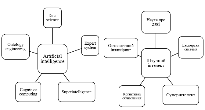 Fig. 1. Generic subordination relationships of the superordinate concepts and the core concept “Artificial Intelligence ‒ “Штучний інтелект”