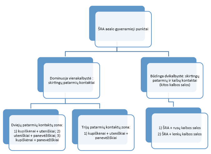 Taigi, visus analizuojamojo arealo gyvenamuosius punktus galima skelti į dvi pagrindines grupes: vienuose dominuoja lietuvių kalbos variantai, o kituose vienu ar kitu būdu sąveikauja lietuvių ir rusų arba lenkų kalbos variantai (žr. 4 pav.).
