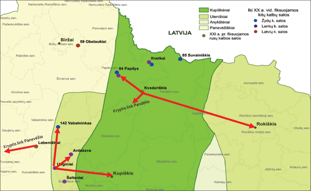 Abstract. The Northeastern Aukštaitijan (NEA) sub-dialect area analysed in this paper is traditionally characterised by numerous linguistic and cultural links. For a relatively long time, people of different nationalities (Lithuanian, Latvian, Polish, Russian, Jewish), speaking their own ethnic languages, lived in this area side by side.