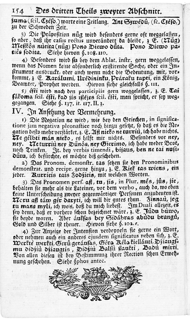 Es wird der Infinitivus einem tempori finito ejusdem radi-ǁcis empha- tice, oder mit Verſtrkung der gemeinen Bedeutung, be=ǁſonders negative gerne wie im Hebriſchen ʒugeſet, ſo daß das ǁ i ult. in e verndert wird. Ʒ. E. Sakyte ſakaù, ich ſage es dir ernſt=ǁlich. Girdėti ‹err. Girdėtegirdėjo, ſie haben es emſig gehret, ַעֹומְׁש ועְמִׁשּ ǁ Negirdėte negirdėjau, ich habe es ganʒ und gar nicht gehret ǁ áugte áugtumbim, wir mchten ungemein wachſen. Diewè důk ǁ kad Káro daugiaus ne mattyte ne mattytumbim, GOtt laß ǁ uns den Krieg gar nicht einmal ʒu ſehen bekommen.