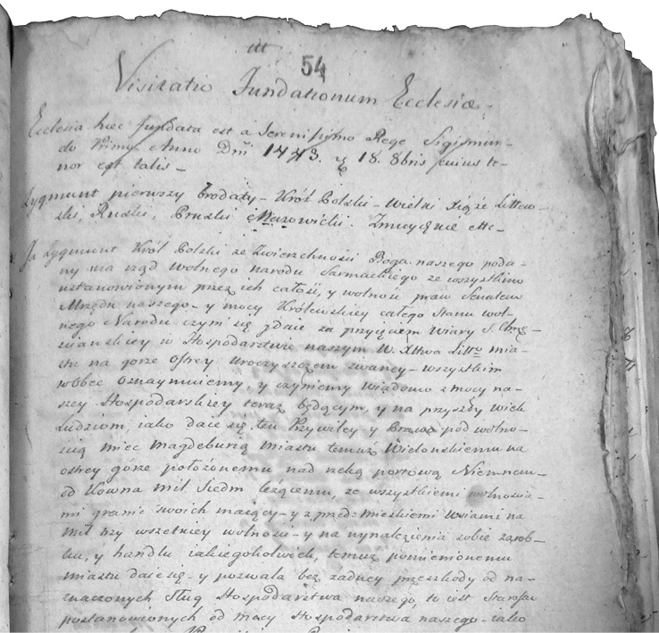 Visitatio Fundationum Ecclesiae. |Tik užmetus akį į aktą tampa aišku, kad pirma eilutė („Visitatio Fundationum Ecclesiae“ – išvertus, „Bažnyčios fundacinių raštų apžiūra“) yra bendra visų Veliuonos bažnyčios fundacinių dokumentų antraštė, suteikta vizitacijos metu (1791 m. rugsėjo 28 d. nuoraše ji niekaip neišskirta ir atrodo tarsi svetimkūnis). Su mums rūpimu falsifikato nuorašu susijęs tik žemiau esantis sakinys; jo vertimas: „Ši bažnyčia įsteigta šviesiausiojo karaliaus Žygimanto I 1443 Viešpaties metais, spalio 18 d. Tas [raštas] skamba šitaip:“ (žemiau yra privilegijos tekstas lenkų kalba).
