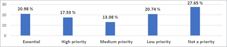 2. The % share between considering language competence as ‘of high importance’ and ‘of low importance’ is similar. In total 51.61 % of the employers consider language qualification as of ‘high importance’. However, a lesser part of the employers stated that language knowledge is important but not of key importance. ‘Medium priority’ includes the categories of ‘low priority’ (27.65 %) or ‘not a priority’ (20.74 %) categories, which is in total 48.49 %.