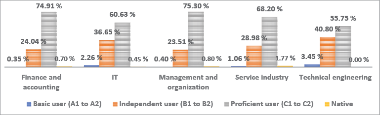 A considerably low percentage of the employers demand the user to use language at Basic levels (1.32 %) and to be a ‘native speaker’ (0.82 %). The highest share of basic user in foreign language proficiency among other industries was recorded technicians (3.45 %) and IT (2.26 %) specialists across all countries.