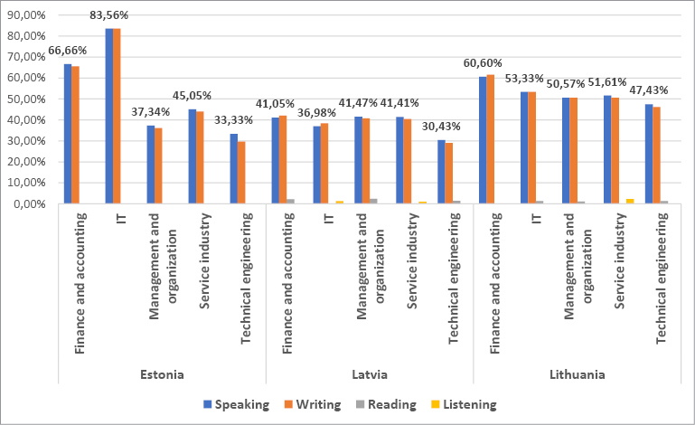 The request for speaking and writing is considerably lower in technical engineering business sector across all countries. For example, compared to IT business sector it is three times lower, with 33.33 % for speaking and 29.62 % for writing in Estonia.