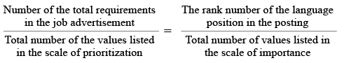 The demands for language at work were researched according to five domains. For this purpose, I constructed a classification framework wherein five categories were determined to define the meaning of language for employability: (1) how many job advertisements list language skills among the qualifications and skills required, (2) language ‘levels of priority’ among other qualifications and skills in the job posting, (3) required language proficiency level, (4) required language skills, (5) demand for multiple languages listed in the job advertisement. However, this study does not consider other elements of job offers in relation to language knowledge, such as requirements for certain occupational skills, or detailed job-related competences.