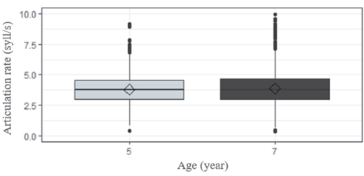 The articulation rate of children’s speech was analyzed with respect to their age. The results revealed no significant difference between the five-year-olds and the seven-year-olds in terms of their articulation rate (Fig. 1). The mean articulation rate was 3.8 syllables per second (SD: 1.4 syll/s) in the 5-year-olds group, while it was 4 syllables per second (SD: 1.8 syll/s) in the 7-year-olds group.
