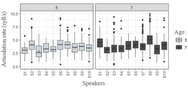 However, there were significant individual differences found between children in both age groups (Fig. 2). The highest value in the 5-year-olds’ group was 4.2 syll/s (SD: 2.9 syll/s), while the highest value in the 7-year-olds’ group was 5.2 syll/s (SD: 3.1 syll/s).