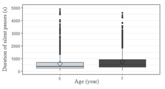 Throughout the entire material, there were 3 130 silent pauses observed, with 1 744 in the 5-year-olds’ speech and 1386 in the 7-year-olds’ speech. The frequency of pauses was very similar in both age groups, with 19.25 items/minute for 5-year-olds and 19.01 items/minute for 7-year-olds. However, the duration of the pauses (Fig. 3) was significantly longer in the 7-year-olds group (mean: 744 ms, SD: 665 ms) than in the 5-year-olds’ speech (mean: 607 ms, SD: 663 ms; Mann-Whitney: Z = -8.960, p < 0.001).