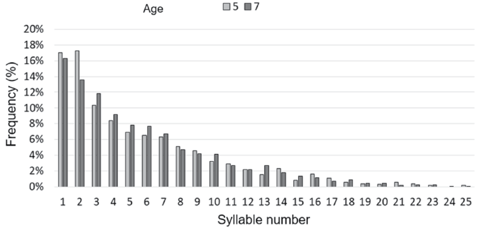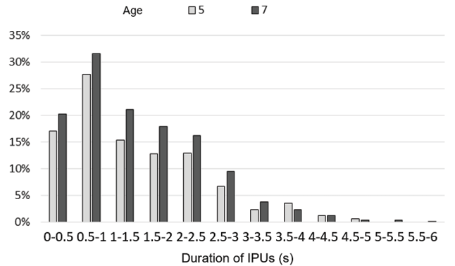 The frequency of interpausal units (IPUs) with different lengths was analyzed and compared between the two age groups (Fig. 4). The results indicate that younger children produced fewer utterances compared to older children, with five-year-olds producing a total of 8 008 IPUs and seven-year-olds producing 10 207 IPUs, representing a 27% increase in utterance production. In terms of length, both age groups had a higher frequency of shorter utterances and a lower frequency of longer utterances, whether analyzed based on syllable count or duration. While the duration-based diagram in Figure 4 suggested that 5-year-olds produced proportionally fewer utterances of each length than 7-year-olds, the syllable-based diagram (Fig. 5) revealed that very short utterances (1.2 syllables) were more common among 5-year-olds, while longer utterances (>2 syllables) were more prevalent in 7-year-olds.