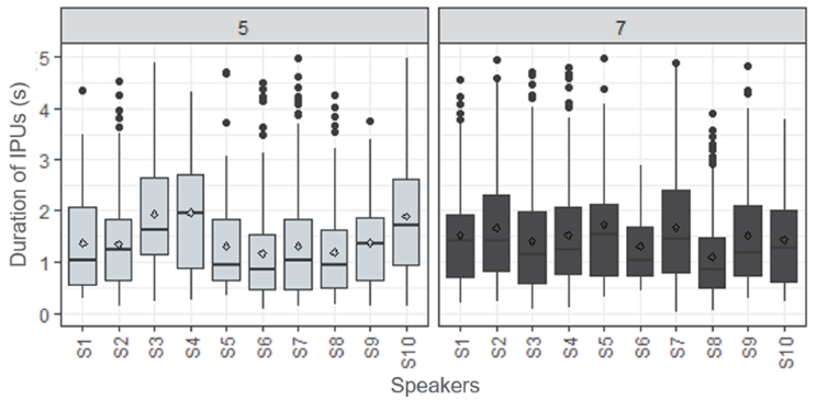 However, individual differences were substantial; the average duration of the shortest IPUs was observed in a 7-year-old speaker (mean: 1.09 s, consisting of 1–3 syllables on average), whereas the longest IPUs on average were produced by a 5-year-old speaker (mean: 2.19 s, consisting of 9 syllables on average) (Fig. 6).