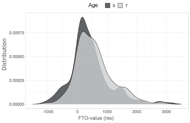 The temporal patterns of turn-taking events were analyzed by examining their FTO values. The distribution of the FTO data was similar in both age groups, as shown in Figure 7. However, there were more negative FTO values in the 5-year-olds’ conversations, indicating a higher frequency of simultaneous speech with the adult speaker. On the other hand, longer pauses were more commonly observed before the children’s utterances when taking turns in the 7-year-olds’ data, suggesting a higher frequency of turn-taking events with longer pauses.