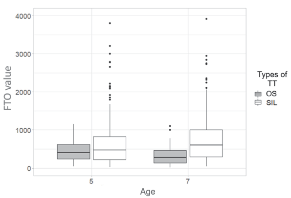 The FTO values were analyzed with respect to age and type of turn-taking (as shown in Fig. 8 and Table 1), using a linear model. The statistical analysis revealed no significant difference based on the age of the children, but it showed a significant effect of the type of turn-taking on the FTO value. Turn-taking events following a pause had a significantly higher FTO value than those following an overlap, indicating a longer time interval between turns (F = 23.515; p < 0.001).
