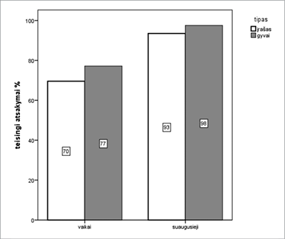 Tyrimo rezultatai parodė, kad vaikai įrašytus žodžius pakartojo 70 proc., o gyvai tartus – 77 proc. tikslumu; suaugusieji įrašytus žodžius pakartojo 93 proc., o gyvai tartus – 98 proc. tikslumu (žr. 2 pav.).