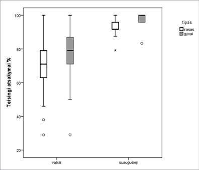 Suaugusieji įrašytus žodžius pakartojo 87–100 proc., o tartus gyvai – 96–100 proc. tikslumu. Suaugusiųjų teisingų atsakymų amplitudės kur kas mažesnės nei vaikų, taip pat matyti skirtumas tarp apatinių rodiklių. Įrašytų žodžių tikslaus pakartojimo apatinis rodiklis yra 87 proc., o gyvai tartų – 96 proc.