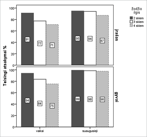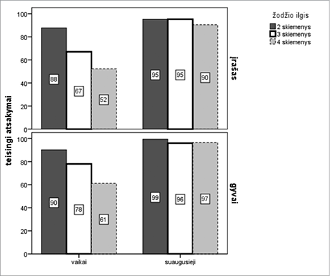 Žodžio ilgis. Šio testo rezultatams svarbu žodžių ilgis, t. y. skiemenų skaičius žodyje. Kaip galima matyti iš 4 pav. pateiktų duomenų, vaikai ilgesnius nei dviejų skiemenų žodžius, pateiktus įrašu, pakartojo kur kas prasčiau nei tartus gyvai. Dviejų skiemenų žodžiai pakartoti panašiai – 88–90 proc. tikslumu; trijų skiemenų žodžiai, pristatyti įrašu, pakartoti 67 proc., o pateikti gyvai – 78 proc. tikslumu (F(1, 98) = 10,388, p < 0,002); keturių skiemenų žodžiai, pristatyti įrašu, pakartoti 52 proc., o pateikti gyvai – 61 proc. tikslumu (F(1, 98) = 4,215, p < 0,043). Taigi, vaikai, trijų ir keturių skiemenų žodžius, tartus gyvai, pakartojo statistiškai reikšmingi tiksliau nei įrašytus. Vis dėlto, skaičiuojant bendrą sąveiką tarp tyrimo skirtingų procedūrų ir žodžio ilgio, ji nėra reikšminga (F(5, 294) = 36,803, p < 0,207).