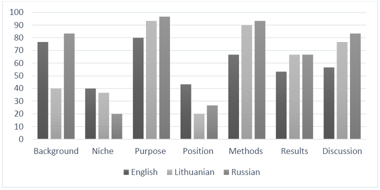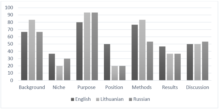 A quantitative comparison of literary abstract structure elements (as indicated in Figure 5) reveals similar trends in the use of 4 out of 7 moves in Lithuanian and Russian abstracts (Purpose, Announcing position, Methods and Discussion moves) in comparison to abstracts in English.