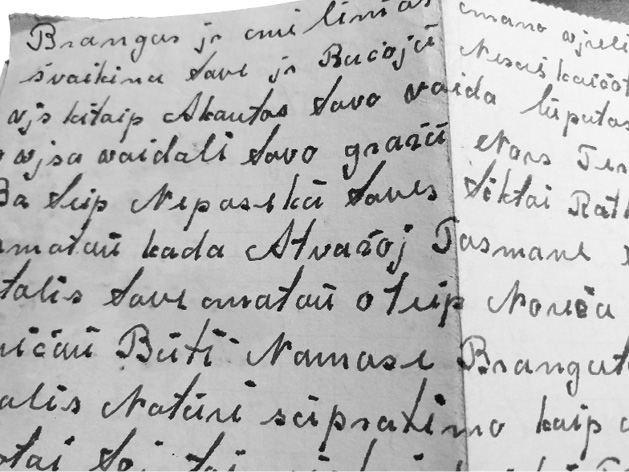 3 Moters laiškuose galima atpažinti senos kartos kauniečių kalbėsenos ženklus, jos rašybos netikslumai (žiūrint iš šiandienos perspektyvos) toli gražu ne visada yra atsitiktinis raidžių praleidimas ar painiojimas. Tačiau tai nėra šio straipsnio tema, o ir mano nekompetencija trukdytų tokį tyrimą atlikti. Čia svarbu, kad šios moters laiškai yra įsivaizduojamo kalbėjimosi fiksavimas raidėmis, beveik nepažįstant rašto kultūros, neturint nei laiškų, nei kitokių tekstų rašymo praktikos.