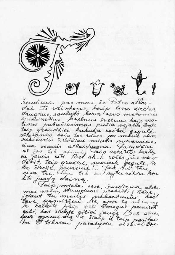 Taip netikėtai gavau Jūsų, taip senai lauktą, laišką. Rašau lauktą dėl to, kad senai norėjau, troškau su Jumis susirašyti. Bet nežinojau Jūsų adreso. Rašyti ten, kur nors, iš kur būčiau galėjęs sužinoti Jūsų adresą, aš nenorėjau, nes galvojau, kad mano laiškas gali sudaryti kai kam nemalonumų.