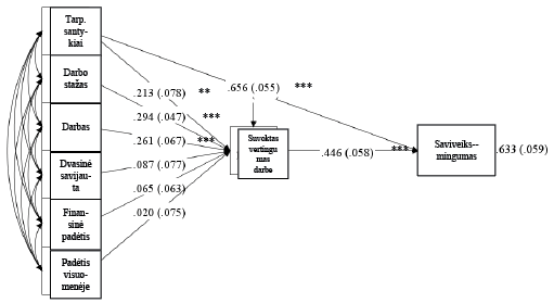 Modelio rezultatai atskleidžia, kad teisėjų padėjėjų profesinį saviveiksmingumą reikšmingai veikia pasitenkinimas tarpasmeniniais santykiais (β = 0,66; p < 0,001) ir suvoktas vertingumas darbe (β = 0,45; p < 0,001) (žr. 1 pav.). Taip pat gauti rezultatai atskleidžia, kad suvoktą vertingumą darbe nulemia pasitenkinimas tarpasmeniniais santykiais (β = 0,21; p = 0,006), pasitenkinimas darbu (β = 0,26; p < 0,001) ir vis didėjantis darbo stažas (β = 0,29; p < 0,001).