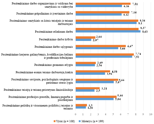 2.1. teisėjos moterys, palyginti su vyrais, yra daug mažiau patenkintos darbo organizavimu ir valdymu bei santykiais su vadovybe (p < 0,01), pripažinimu ir įvertinimu darbe (p < 0,01), darbo sąlygomis (p < 0,01), savijauta, psichologiniu saugumu ir patiriamo streso lygiu (p < 0,05), taip pat daug labiau nepatenkintos darbo krūviu (p < 0,05), esamu teismo darbuotojų kiekiu (p < 0,05) bei teisėjų ir teismų pristatymu žiniasklaidoje (p < 0,01);